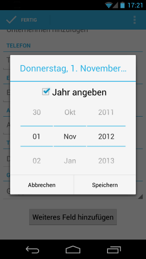 Über den Webdienst von GMail ist aber natürlich möglich den Geburtstag in den Kontakt einzupflegen. Abhilfe wird es sehr wahrscheinlich im nächsten kleinen Android Jelly Bean Update geben. Gerüchteweise soll dieses ja nicht mehr lange auf sich warten lassen.