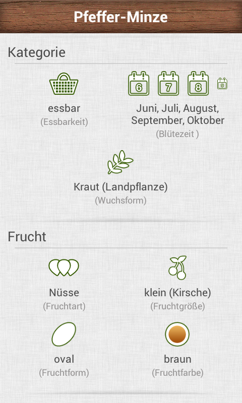 Im Bestimmungsmodus bestimmt man die Kräuter und Beeren nach verschiedenen Merkmalen. Man wählt die Kategorie: Beeren, Kräuter, Früchte und Nüsse. Die Suche läßt sich auch nach der Essbarkeit eingrenzen. Als Filter gibt es auch noch die Einstellungen Blütezeit, Fruchtreife und Erntezeit. Wie es üblich ist, bei den Android Naturbestimmungs-Apps lassen sich die Ergebniss auch nach dem Aussehen Filtern.