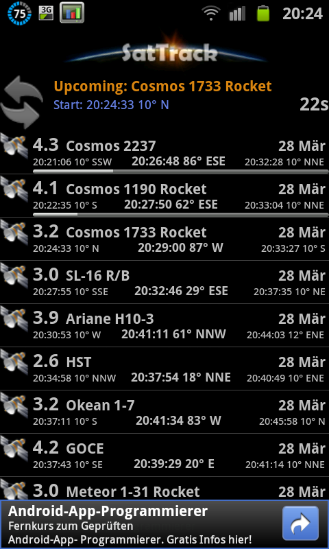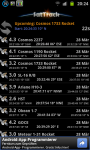 Für alle diejenigen unter uns die sich für Raumfahrt-Technik und unbemannte Raumfahrt interessieren ist die App SatTrack (früher hieß die App Heavens Above) von Preston MobiWare ein Blick wert. Diese App gibt einen Überblick über zahlreiche Satelliten die um unsere Erde auf verschiedenen Umlaufbahnen umherschwirren. Es werden auch die Daten der ISS angezeigt. Aber auch die Daten von den Umlaufbahnen der GPS Satelliten und den verschiedenen Wettersatelliten werden angezeigt. Über die Nachrichtenleiste des Android Smartphone kam man sich auch über bestimmte Flugbahn Ereignisse eines Flugkörpers benachrichtigen lassen. Die Flugbahn Daten der Satelliten bezieht übrigens die App von der Website www.heavens-above.com. Es handelt sich aber nicht um eine offizielle App der Heavens Above Webseiten Betreiber. Die App ist im Playstore Gratis erhältlich, es gibt ber zur Unterstützung der Entwickler eine Donate Version. Also für alle Interessierten der Raumfahrttechnik und Raumfahrt, ist diese App sicherlich sehr empfehlenswert. Der Datenumfang ist gewaltig und die Aufbereitung der Flugbahnen der Weltraum Objekte ist sehr ansehnlich. Auf diesem Sektor ist es sicherlich eine Top-App.