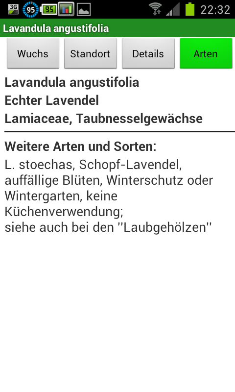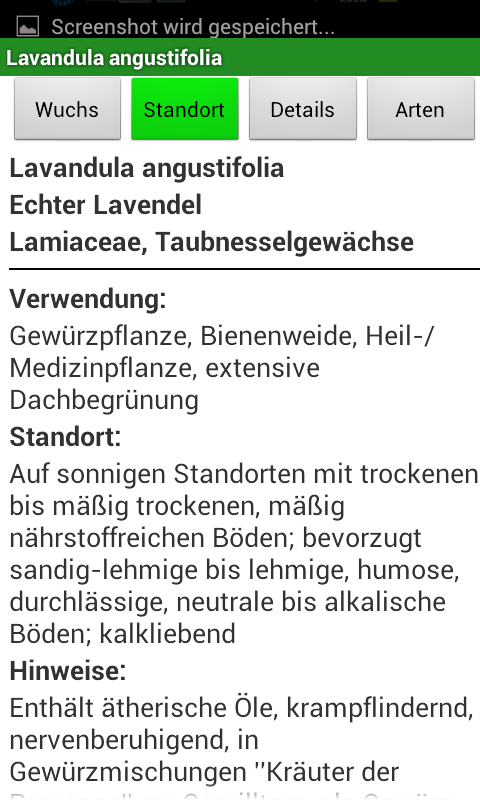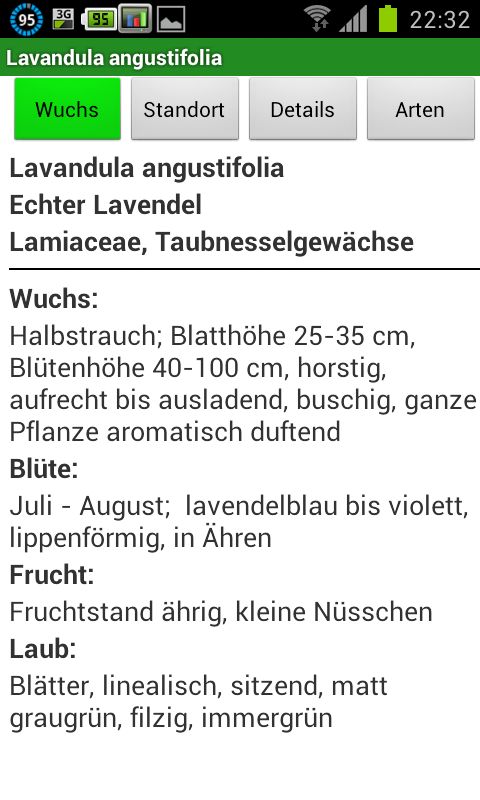 Leider ist die App weniger für den Natur begeisterten Wanderer zu empfehlen. Man merkt der App schon die eigentliche Zielgruppe an: sie richtet sich vor allem an Auszubildende im Garten- und Landschaftsbau. Die Beschreibungen der Pflanzen wurde in Anlehnung an prüfungsrelevanten Fragen zur Pflanzenkunde ausgerichtet. So informiert sie über die bei uns in den Gärten gebräuchlichsten Pflanzen und deren Verwendung.
