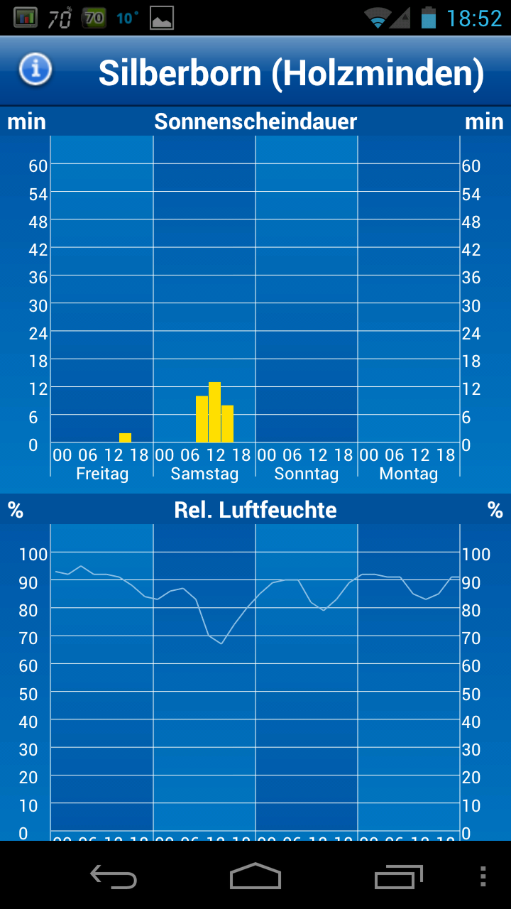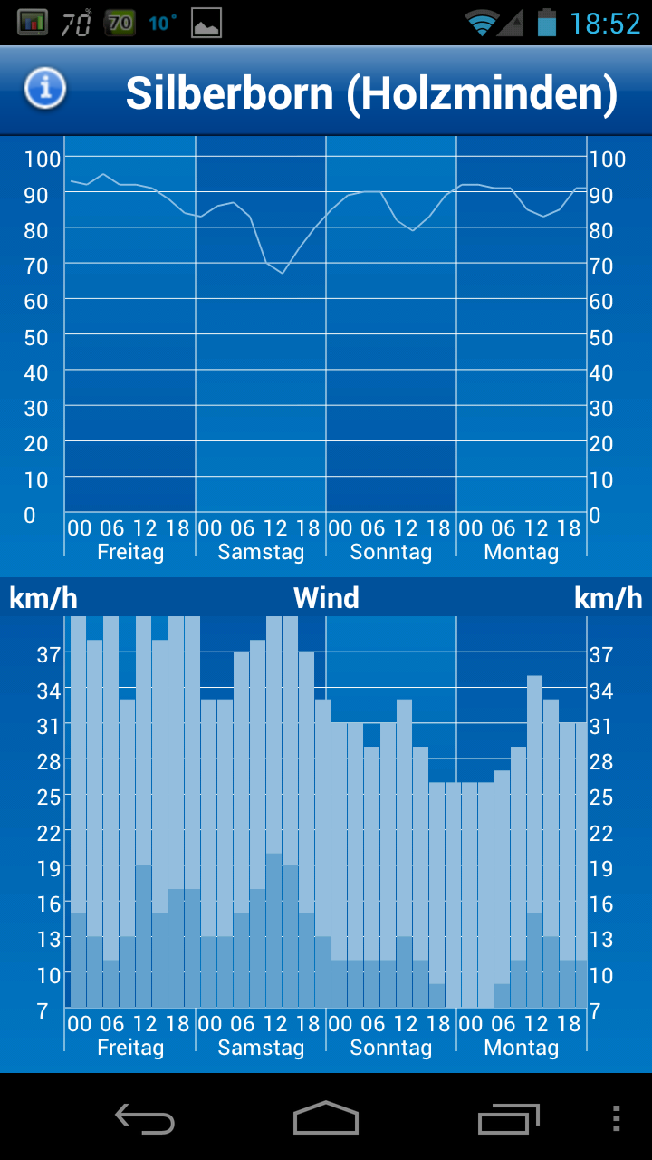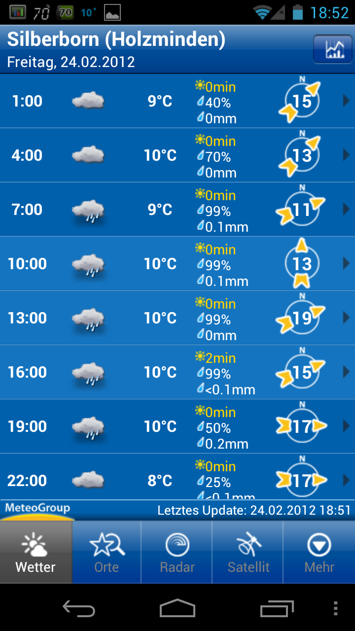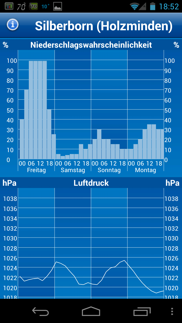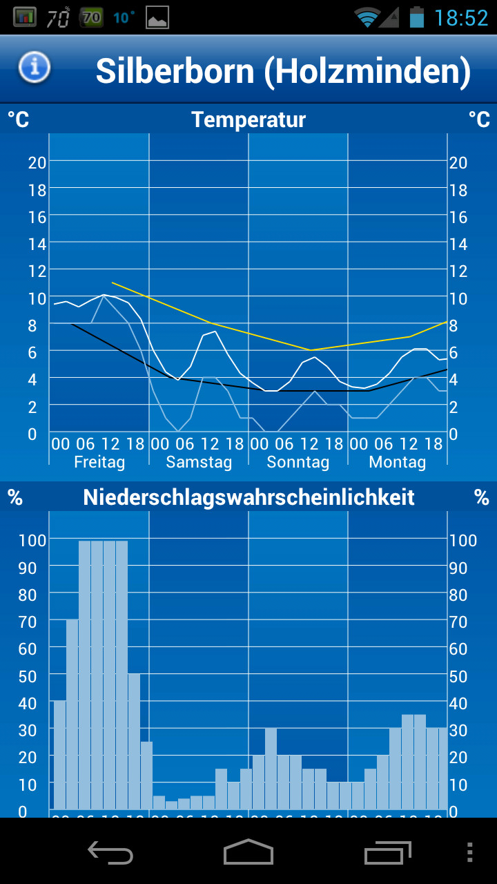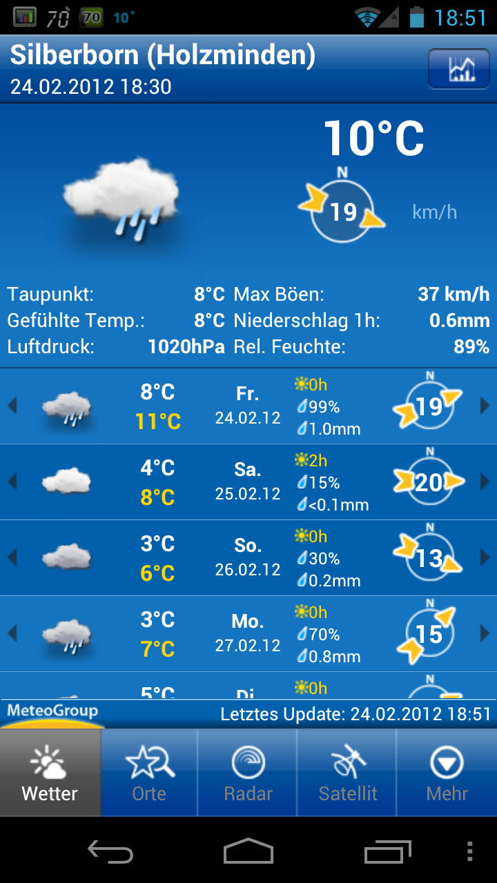 Wie wird das Wetter in den kommenden Tagen? Dieses möchte uns die App Weather Pro in ansprechender Weise und mit Infograifk, aufzeigen. Nachdem man einen Ort gewählt hat, verrät einem die App auf einer Übersichtsseite die Wetterdaten der kommen 7 Tage. Es gibt eine Maximum/Minimum Ansicht von einem Tag und eine detaillierte, nach Stunden aufgeschlüsselte Ansicht. Neben den Temperaturen, verrät einem Weather Pro die Sonnenscheindauer, Niederschlagswahrscheinlichkeit und Menge. Noch dazu gibt es Angaben zur Windgeschwindigkeit und Richtung. Man kann sich auch eine Infografik der kommenden 3 Tage anschauen. Dort gibt es Daten für die Temperatur, Niederschlagswahrscheinlichkeit, Luftdruck, Sonnenscheindauer, relative Luftfeuchte und Windgeschwindigkeit. Ein Niederschlagsradar gibt es ebenso wie eine Satellitenansicht zum Erkennen von Wolkenfeldern. Die App bringt Informationen über das kommende Wetter auf übersichtliche und anschauliche Weise auf den Android. Widgets in den gängigen Größen gibt es natürlich auch.