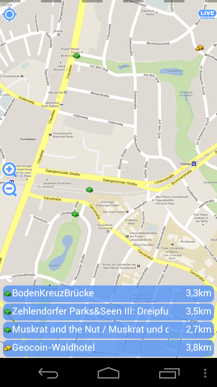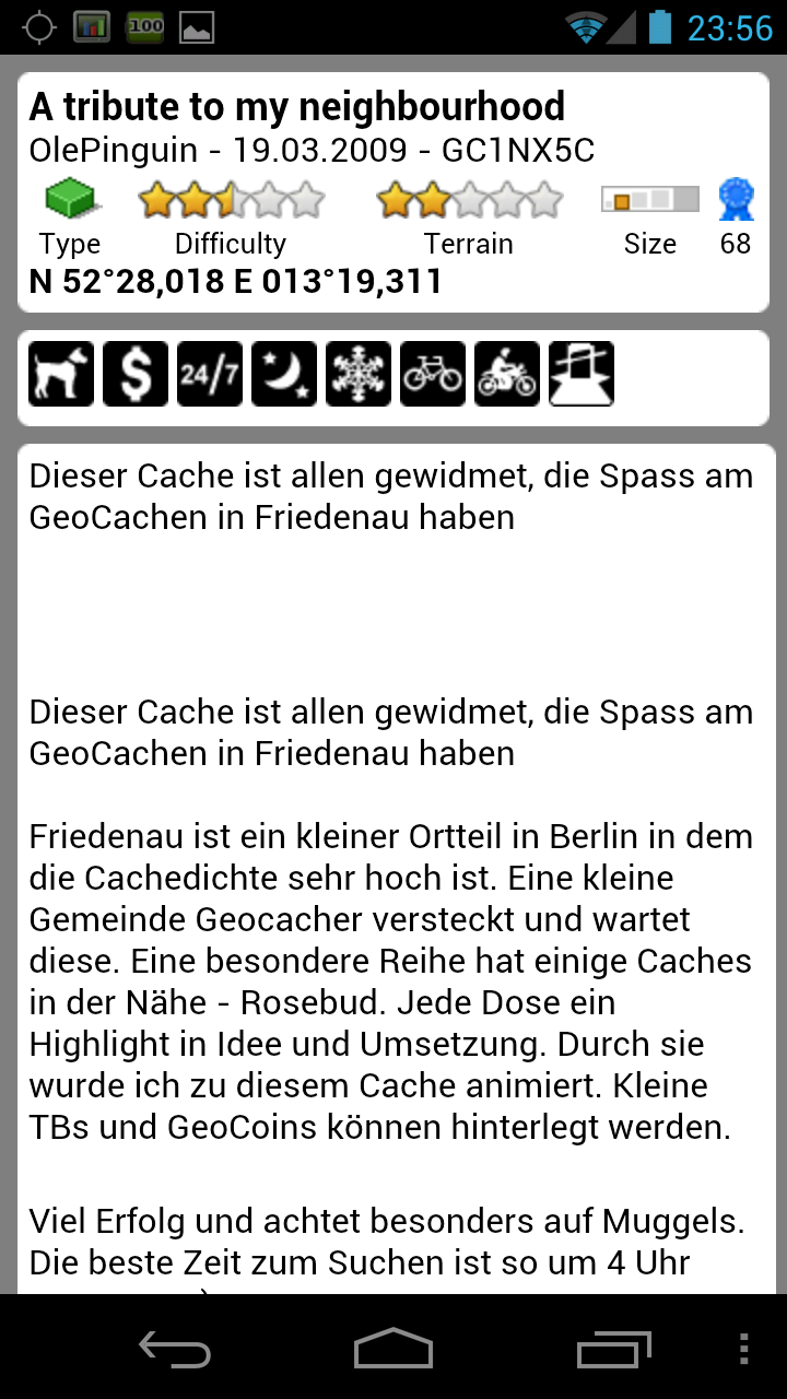 Die Caches werden auf der Map etwas klein angezeigt. Der Cachetyp läßt sich aber dennoch erkennen. Schön ist, dass man in der Kartenansicht gleich die 4 Caches die der Kartenmitte am nächsten liegen angezeigt werden. In der Cacheliste gibt es auch einen guten Überblick der Caches die in der Nähe sind. Klickt man auf den Cachenamen kommt man in die Detailansicht des Caches. Dort enthalten ist die Cachebeschreibung aber auch die letzten Logs kann man lesen. Es werden die Attribute angezeigt und falls Geocoin oder Travelbug enthalten sind erscheinen deren Namen.