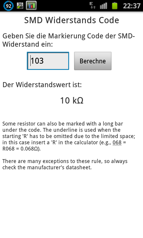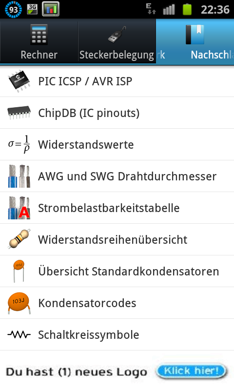 ElectroDroid von Demetrio Iero ist eine App die sich an Elektroniker und Bastler richtet, kurzum eine Elektro-Berechnungs-App. Es bietet jede Menge Informationen zum Thema Elektronik. Es gibt viele übersichtliche Tabellen. Widerstands Farbcodes, Farbcodes für Spulen und SMD Widerstands Code. Interessant sind auch die interaktiven Formelrechner für das Ohmsche Gesetz, Spannungsteiler Widerstandswert in der parallel und Reihenschaltung. Es gibt außerdem Rechner für die Batterielebensdauer und Operationsverstärker. Ferner bietet die App Berechnungsmöglichkeiten für LED Widerstände, LM317 Berechnung, Kondensatorladung. ElectroDroid beeinhaltet außerdem Steckerbelegungen für viele gängige Stecker. Zum Beispiel USB Kabel, Serielle Kabel, Paralellel Port Kabel, SCART, DVI, HDMI, VGA Kabel und FireWire und noch einige mehr. Die App bietet also viele Informationen für den täglichen Gebrauch beim Löten und Basteln. Der (Hobby-) Elektroniker oder auch Elektriker findet hier eine wahre Fundgrube an Informationen. Zusätzlich gibt es noch ein paar Nachschlage Werke. Dort gibt es Infos zu Strombelastbarkeiten von Kabeln, Widerstandsreihen, Standardkondensatoren, Schaltkreissymbole und Batterien wie Lithium Zellen und Knopfzellen. Falls man zum Kreis der (Hobby-)Elektroniker gehört lohnt es sich in jedem Fall diiese kleine App auf seinem Smartphone zu installieren.
