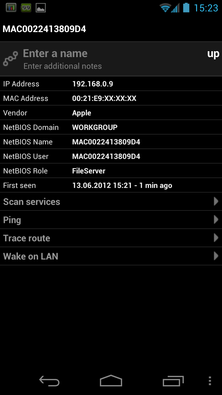 Klickt man in der Liste auf ein Gerät erhält man weitere Angaben zum Gerät. Hier lassen sich auch verschiedene Tests starten. Hier startet man zum Beispiel den Portscan. Es gibt hier die Auflistung der Networkservices. Ein Ping-Test und die Funktion Traceroute lassen sich auch gezielt auf das Netzwerkgerät starten. Für Geräte die mit dem Dienst Windows Network arbeiten erfährt man hier noch die Netbios Domain, den Netbios Namen und die Netbios Role. Hier gibt es also alle wichtigen Funktionen nah beienander. Dem Netzwerk Admin ergeben sich also vielfältige Testmöglichkeiten auf dem Smartphone.