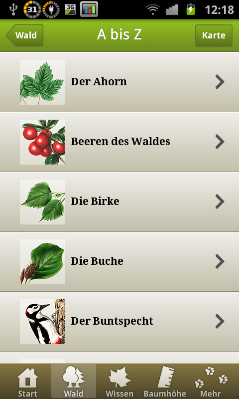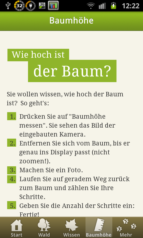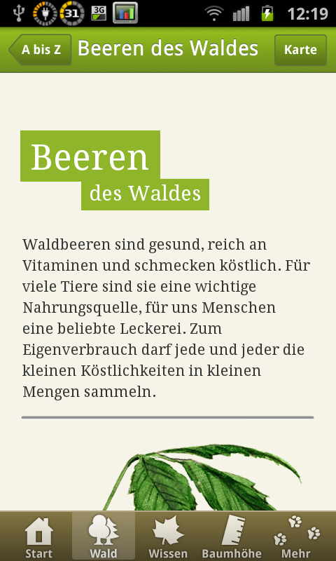 Ein Begleiter für Wanderungen und Naturerlebnisse ist die Waldfibel. Herausgegeben wurde die kostenlose App vom Bundesministerium für Ernährung, Landwirtschaft und Verbraucherschutz. Sie umfasst eine Übersicht der Tiere und Pflanzen des heimischen Waldes. Es gibt diverse Artikel, die mit sehr guten Farbzeichnungen angereichert sind. Man sollte so relativ leicht Pflanzen und Tiere bestimmen können. Auch generelle Informationen über den Wald möchte die App anschaulich und reichlich bebildert vermitteln. Zum Zeitverteib bei Pausen auf langen Wanderungen ist ein kleines Wald-Quiz eingebaut, womit man sein Wissen noch beim Wandern sogleich überprüfen kann. Als extra Gimmick gibt es einen Baumhöhenmesser, mit dem man Vorort die Höhe eines Baumes in etwa „messen“ kann. Für Naturbegeisterte und Outdoor Fans eine sicherlich empfehlenswerte App. Die Programmierer sollten allerdings an der Kompatibilität noch etwas arbeiten. So ist das Programm leider auf dem Galaxy Nexus und laut dem Play Store auch nicht auf Tablets lauffähig. Das sollte wirklich noch nachgebessert werden. Ebenso, wie eine Funktion zum Beenden, es kann ja nicht sein, dass man die App per Taskkiller beenden muss.
