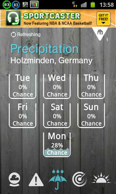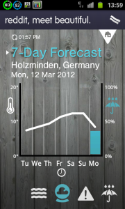 Die meisten Wetter Apps sind sich ja doch sehr ähnlich im Erscheinungsbild. 1Weather App geht da optisch ganz andere Wege. Es ist ein sehr minimalistisches Design bei dem die Information an Erster Stelle steht. Leider ist die Funktionalität noch nicht allen Bereichen komplett. So fehlt zum Beispiel in Europa die Wetterradar Ansicht. Bislang ist diese Funktion wohl auf Nordamerika beschränkt. Die Twitter Einbindung und auch die „Top Weather Pics“ machen für mich keine echten Sinn. Die Tages und Sieben Tages Vorschau mit kleinem Diagramm gefällt mir extrem gut. Die Funktion um das Diagramm anzuzeigen ist allerdings etwas versteckt. Man klickt neben Today auf den kleinen Pfeil und schwupps, da ist das Diagramm. Ebenso bei der 7 Tage Vorschau. Die Niederschlagsvorhersage „Precipitation“ gefällt mir von der Grafik auch sehr gut. So sollte eine Infografik aussehen. Schlicht aber Informativ. Als Ergänzung gibt es dann noch die Seite „Sun&Moon“. Hier gibt es Angaben zu unserem Erdtrabanten und unserer Sonne. Also Mondphase und Auf- und Untergang von Sonne und Mond. Weiterer Nachteil der App: Bislang gibt es sie nur in englisch. Auch kleinere Ortschaften in Deutschland haben keine Wetterinformationen. Hier würde ich mich freuen wenn die Programierer in zukünftigen Versionen nachlegen könnten.