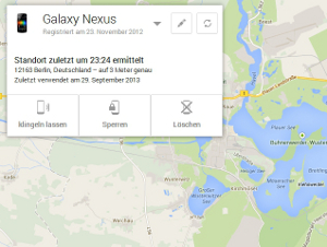 Mit dem Android Geräte-Manager ist es möglich das Android Smartphone, falls es gestohlen oder verloren gegangen ist, einige Aktionen auszulösen. Hat man das Android Smartphone verlegt kann man mit dem Android Geräte-Manager das Android Smartphone klingeln lassen. Solange der Akku nicht schlapp macht ist dies eine gute Hilfe das Handy wiederzufinden. Ein bisschen hängt es hier aber auch von dem eingestellten Klingelsound ab, den der Sound wird für das spezielle Klingeln nicht verändert. Allerdings klingelt das Android Smartphone mit voller Lautstärke.