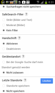 Eingestellt wird die Funtkion direkt im Android-Browser. Geht man auf die Google Hauptseite www.google.de mit dem Androd Smartphone Browser kann man auf dem Link Einstellungen auf diverse Setup Möglichkeiten hinweisen. Unter anderem legt man hier fest, ob die Suchanfragen gespeichert werden oder ob für die Google Suche der eigene Standort genutzt werden darf.