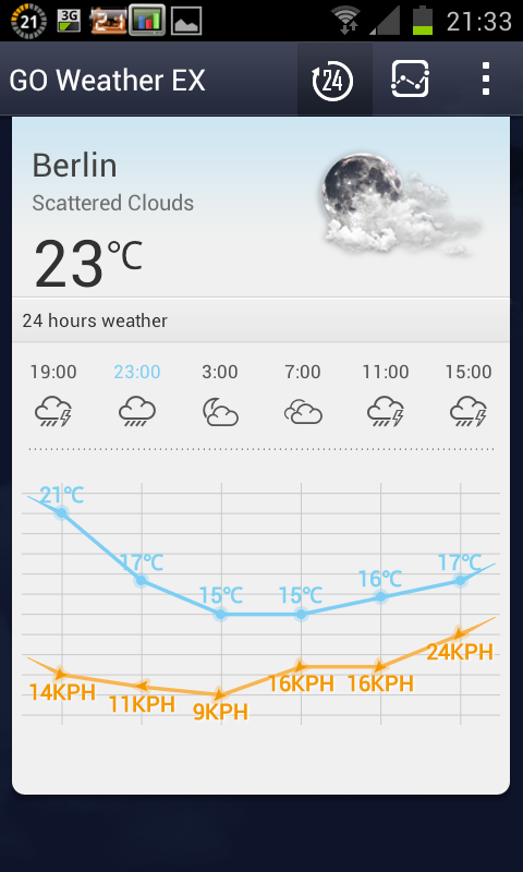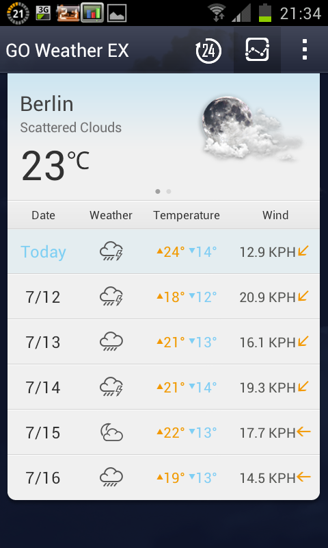 Die Grafik ist in einem komplett anderen Design als die von GO Weather. Überhaupt scheint das GO Design Team neue Designs zu verbreiten. Mir gefällt das schlichte Design der Wetter App recht gut. Es dient durchaus der Übersichtlichkeit und man kann alle relevanten Informationen schnell ablesen. Die Bedienung der Wetter App ist logisch aufgebaut. Es gibt natürlich bei solcher App auch nicht viel zu bedienen. Es gibt übersichtle Wetteransichten für die nächsten 24 Stunden oder auch für die kommende Woche. Die Temperatur und die Windstärke werden grafisch angezeigt. Auch bei der Wochenansicht gibt es diese Informationen, allerdings ohne Diagramm.