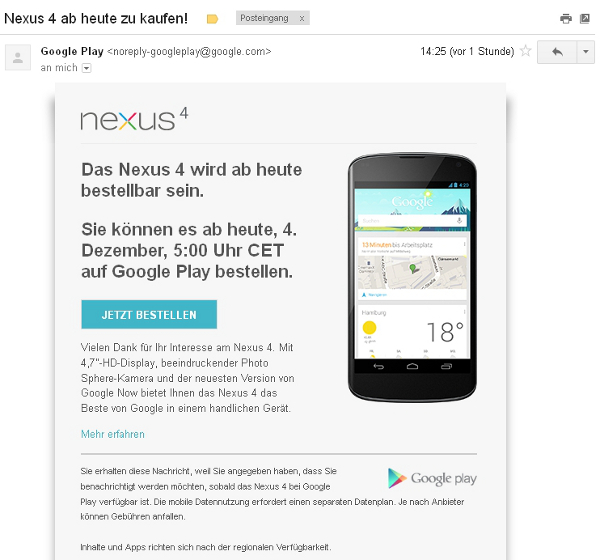 Unglaublich! Da checke ich doch eben mein Gmail Konto und was kann ich lesen: Nexus 4 ab heute zu kaufen! Die Mail trudelte um 14:25 in meinem Account ein. Auch bei anderen Blogs kann man lesen, dass die Mail empfangen wurde so zum Beispiel bei mobiflip.de und AndroidPit.de. Es sieht tatsächlich so aus, als wenn Googe nochmal die Funktionalität des Google Play Store testen möchte :-). Das Google Nexus 4 soll wohl tatsächlich Heute am 4.12. ab 17 Uhr wieder bei Google Play zu bestellen sein.