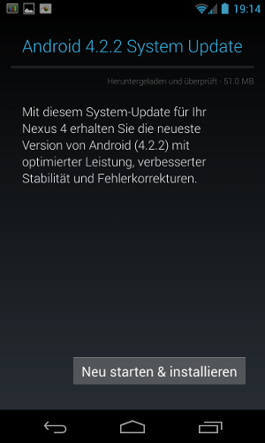 google-nexus-4-jelly-bean-update-4-2-2-meldungDer Download des Android 4.2.2 Updates ging zügig voran und die 51MB große Datei war schnell auf dem Google Nexus 4 runtergeladen. Hoffentlich ist es ein Update, welches die kleine unrunden Vorgänge ausmerzt. Ich hoffe, dass die Kamera App wieder etwas zügiger läuft. Die Akkulaufzeit könnte auch etwas besser sein, wobei ich, anders als viele Meldungen im Netz, eigentlich recht zufrieden war. Bei normale Nutzung etwas über 1,5 Tage waren bei mir durchaus normal.