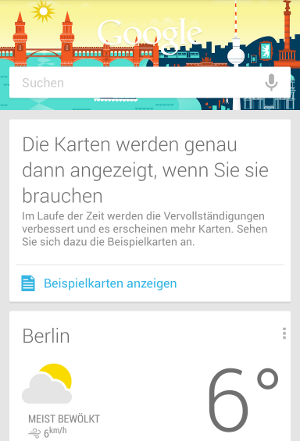 Bei Google Now sind aber auch die sogenannten Karten eine Besonderheit. Startet man Google Now so erscheinen die Google Now Karten. Hier zeigt Google Now Informations-Karten die für den User von Google Now interessant sein könnten. Meistens wird hier das Wetter gezeigt. Aber auch Verkehrsinformationen für den Weg zur Arbeit kann man so mit einem Blick auf das Smartphone anschauen.