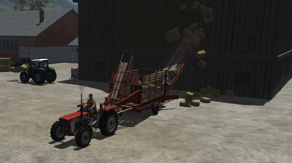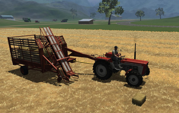 Das zweite historische, landwirtschaftliche Gerät ist ein Ballensammelwagen der Firma Lizard. Die Firma Lizard ist ein fiktiver Landwirtschafts-Geräte Hersteller. Das heißt die Firma Lizard wurde von Astragon erfunden. Es gibt ja auch im Grundspiel des Landwritschafts-Simulator 2011 Lizard-Traktoren. Diese sind ebenfalls ausgedacht, aber Traktoren die es in der jeweiligen Epoche gab nachempfunden. Passend zu den historischen Geräten und Traktoren des Erweiterungspaket Klassiker der Landwirtschaft, gibt es hier noch einen Sammelwagen zum Anhängen an die alten Traktoren. Hiermit können die Strohballen, also die kleinen Quaderballen, die mit der Fahr Ballenpresse hergestellt wurden, bequem zum Bauernhof gebracht werden. Hier können sie eingelagert, bzw. verkauft werden.