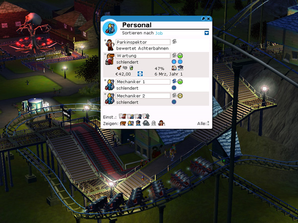 - Personal prüfen und einstellen (Menü Parkverwaltung > Personal): Für vorhandene Fahrten und Stände wird mindestens ein Mechaniker für Inspektionen und Reparatur gebraucht. Ein Wartungsmitarbeiter kann zunächst als Springer auf Bedarf eingestellt werden (Beete gießen ausstellen). Viele, stark verschmutzte Wege brauchen mehr Wartungsmitarbeiter (Fegen als einzige Aufgabe). Für alle Mitarbeiter sollte der Pausenbedarf über Gehaltsanpassung und einer ersten Schulung auf unter 15% gebracht werden.
