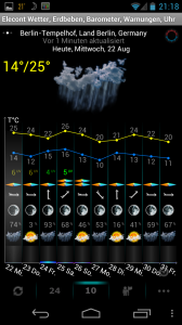 Ich denke die Kategorie Wetter-App zählt bei Google Play mit zu der häufigsten App Art. Nach kurzem Nachdenken fallen eigentlich jedem Android Smartphone Begeisterten bestimmt 10 verschiedene Wetter Apps ein. Die Android App eWeatherHD von Elecont Software fällt aber schon durch ihr Design ins Auge. Die Wetterdaten werden hier mal in einer ganz anderen Art aufbereitet. Die Android App hat auch spezielle Anzeigen für den Luftdruck und auch Erdbeben werden angezeigt. Soweit ich weiß funktioniert das aber nur in den USA.